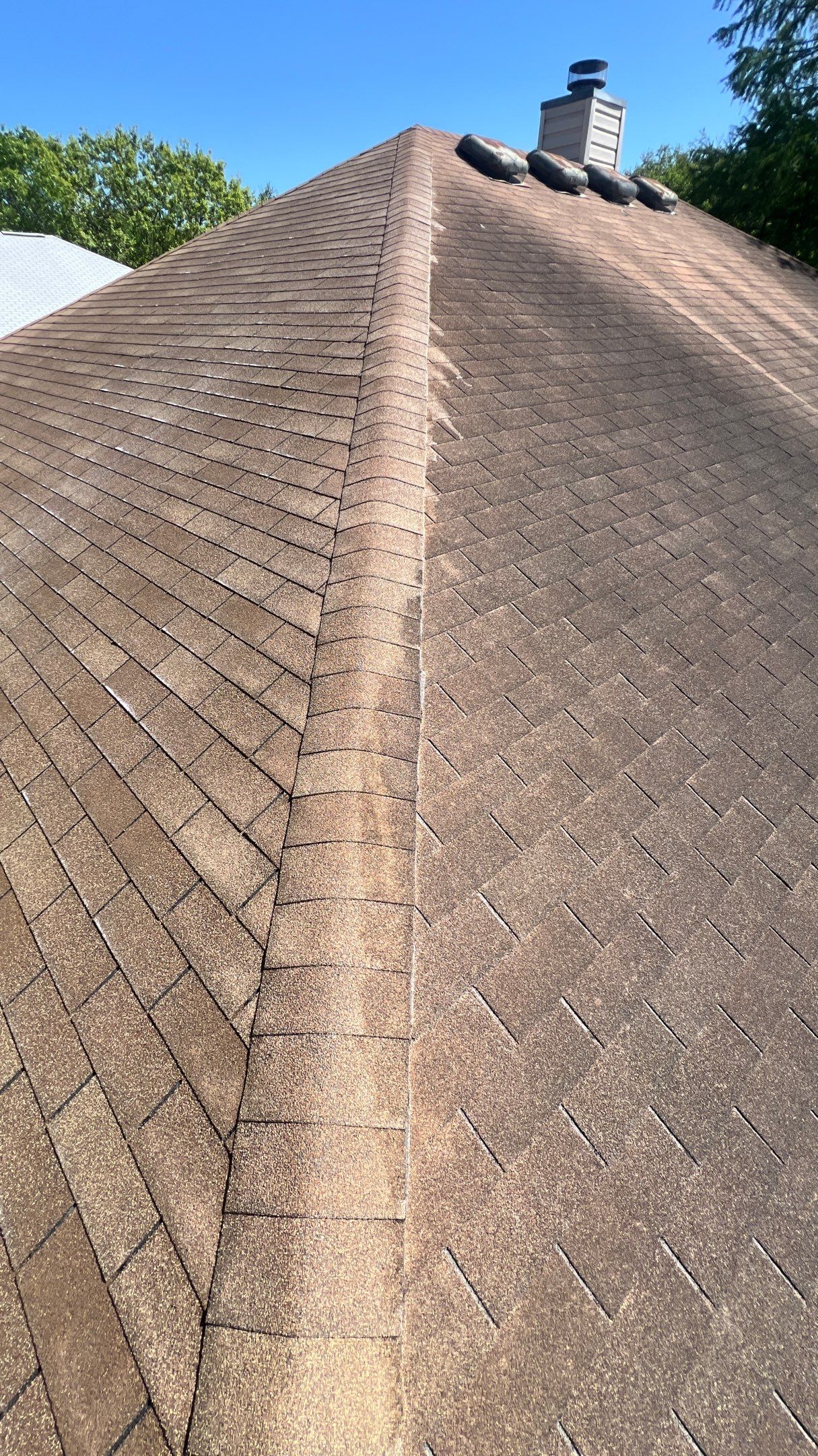 We used a low-pressure roof soft wash system, a method designed to safely remove algae, mildew, and other organic buildup without damaging asphalt shingles. Low pressure protects the shingles from erosion and granule loss, while still delivering a deep, long-lasting clean. This approach differs from high-pressure washing, which can accelerate shingle wear and shorten roof life.